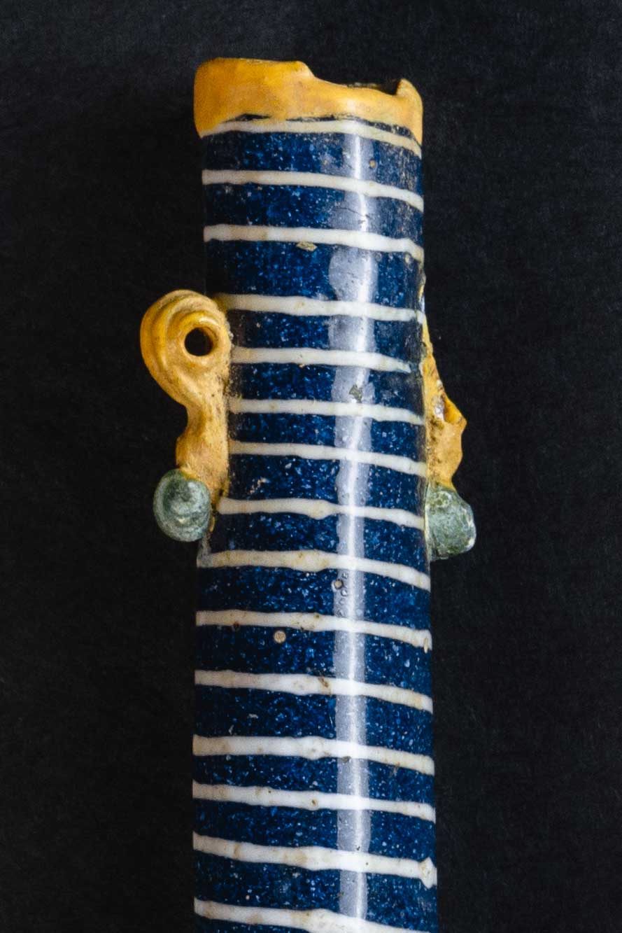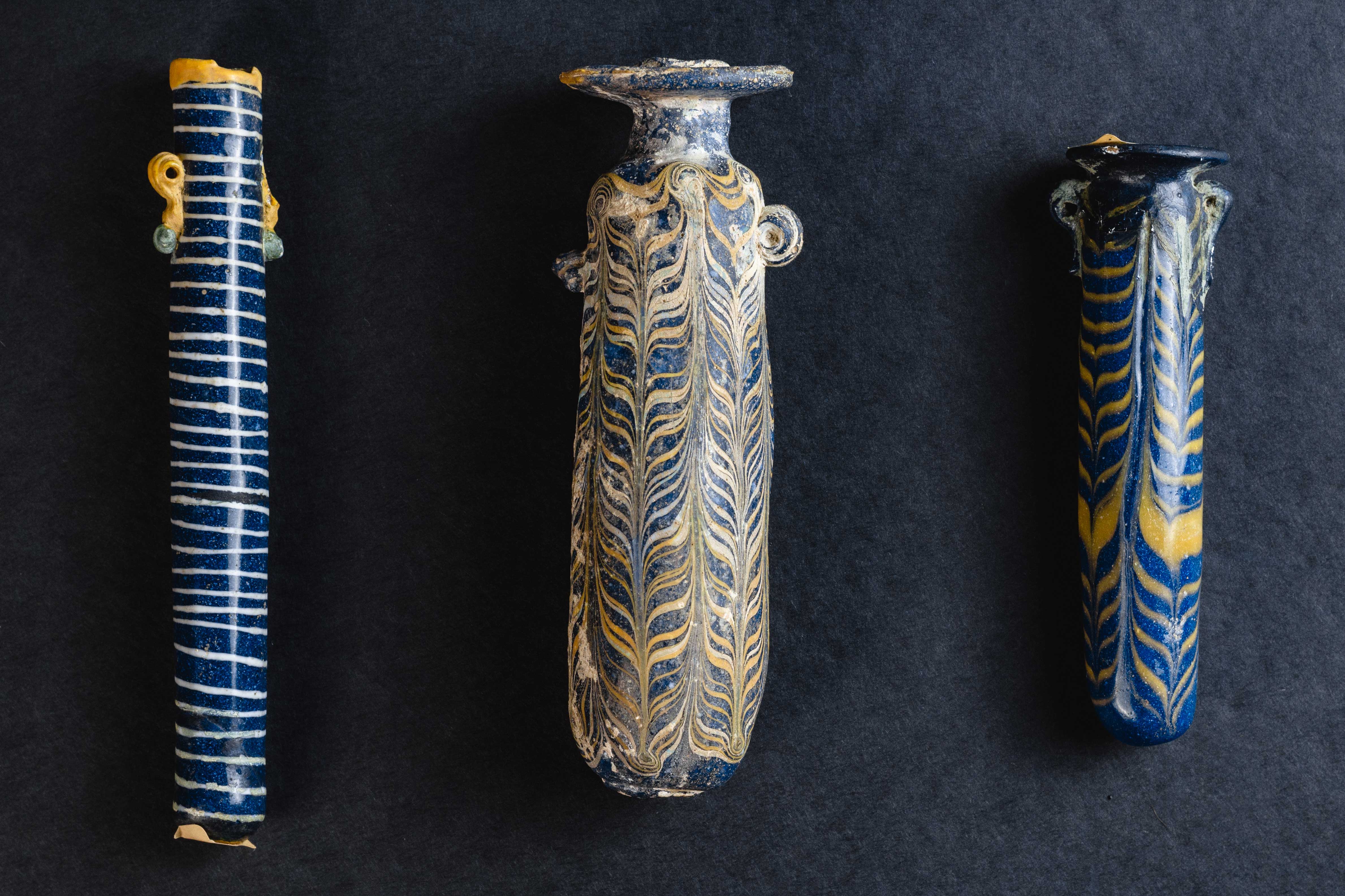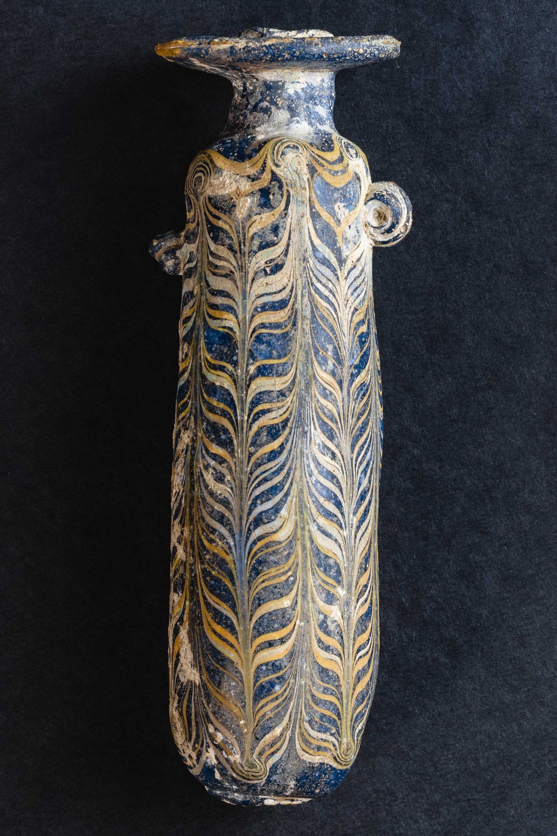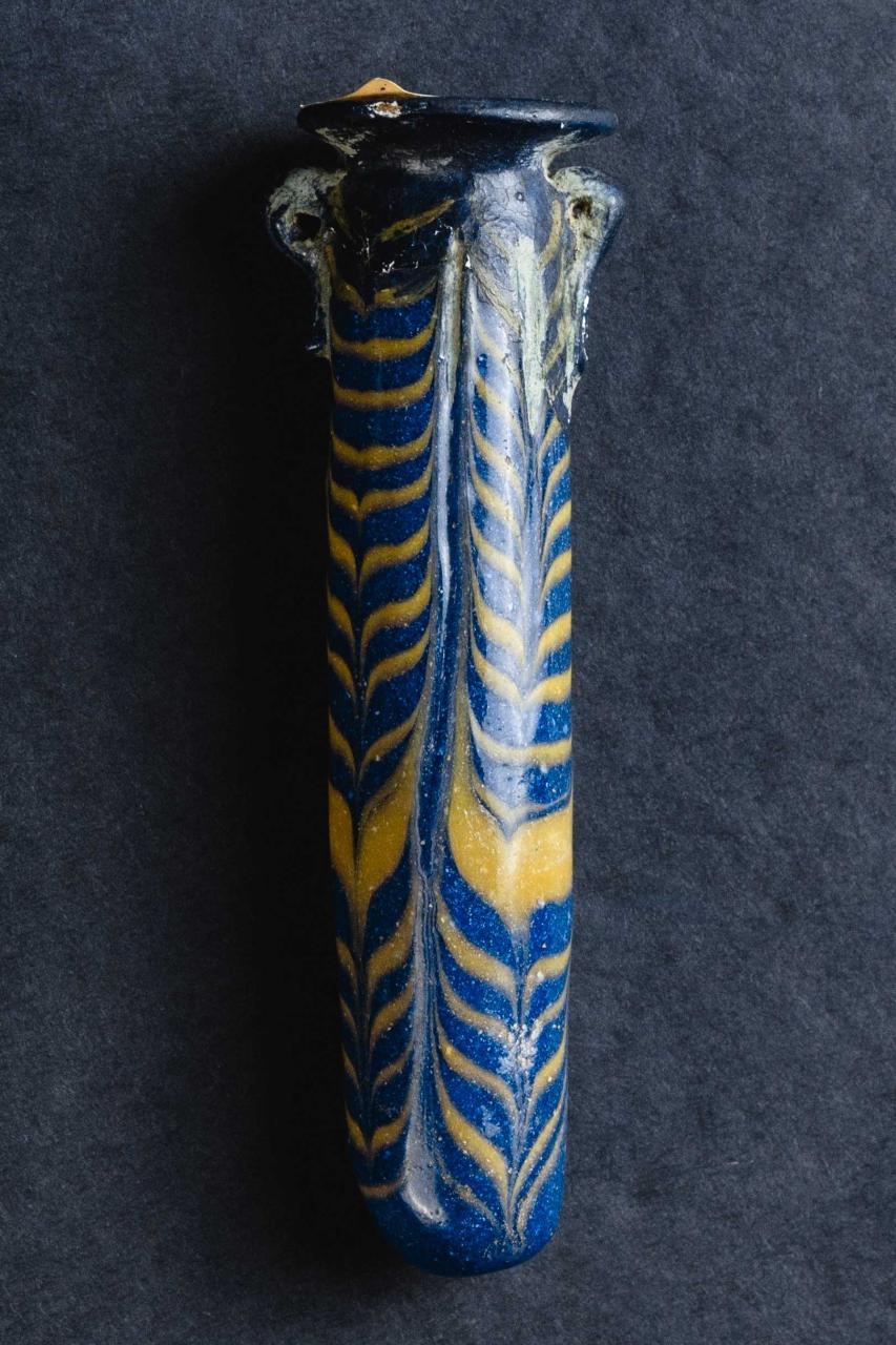 Tra i reperti più affascinanti giunti fino a noi, spiccano i balsamari in pasta vitrea policroma, spesso su fondo azzurro e dalla caratteristica forma “a bottiglia lentiforme”. La loro realizzazione era un mix di artigianato e creatività: il vetro caldo veniva colato su un nucleo friabile (in argilla e sabbia), modellato con strumenti metallici, e decorato con linee, spirali o festoni. Quando il balsamario si raffreddava, il nucleo interno veniva frantumato, lasciando il contenitore cavo e pronto all’uso.